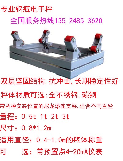该系列钢瓶秤适用于化工、自来水、纺织染印、制造等行业称量液态氯气、氨气等储气钢瓶。秤台钢瓶支架可以方面钢瓶转动。